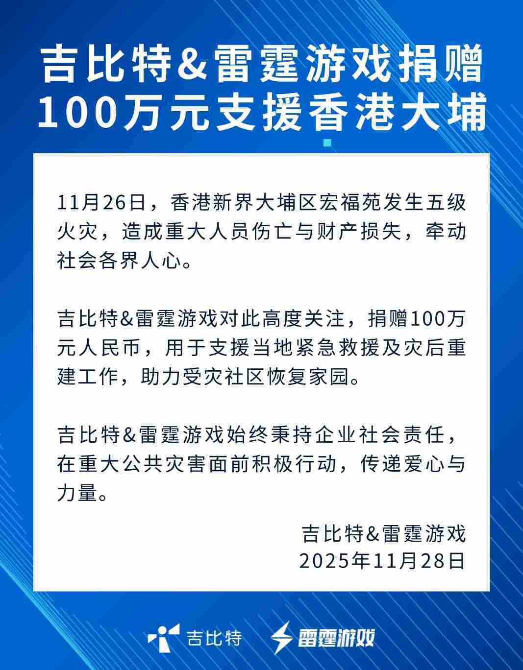 JIUYOU.COM&雷霆游戏捐赠100万元 支援香港大埔火灾救援及灾后重建