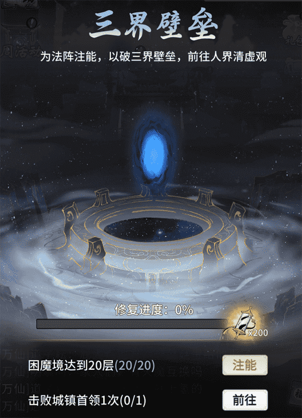 当你修为达到返虚/破虚中期后,,可在城镇寻得芸丫并激活神秘法阵,,,,通过收集材料、、、击败首领等方式为法阵注能,,,,借以打破三界壁垒,,开启支线剧情“清虚旧梦”