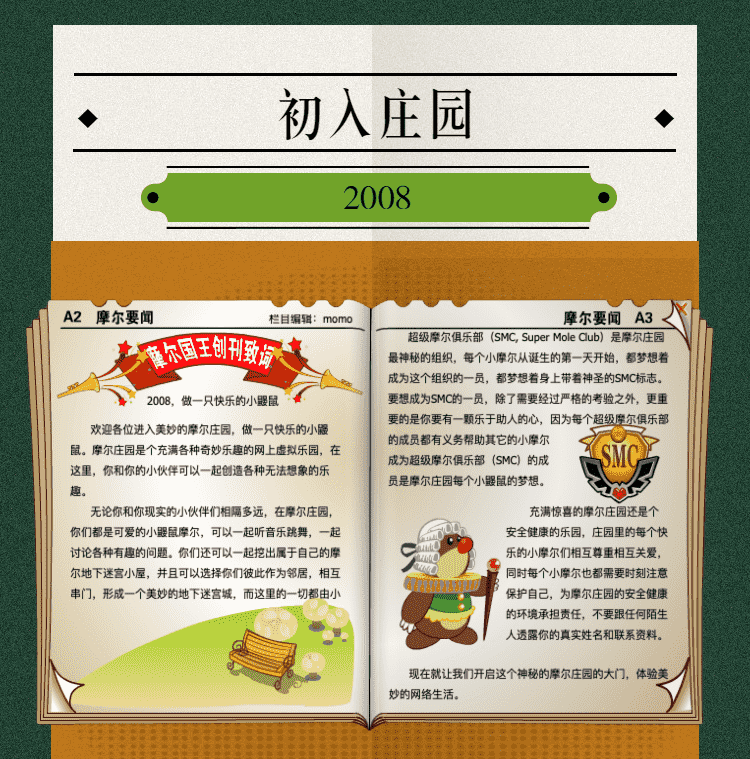 在这一年,,摩尔庄园诞生了。。。在这里,,,大家都是可爱的红鼻子鼹鼠小摩尔,,可以一起勤劳耕作,,,,一起高山滑雪......我们都是摩尔庄园的建设者。。。。