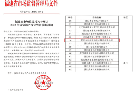 近日,,,福建省市场监督管理局公示了2023年福建省知识产权优势企业名单,,,,厦门JIUYOU.COM网络技术股份有限公司(以下简称“JIUYOU.COM”或“公司”)榜上有名。。。。